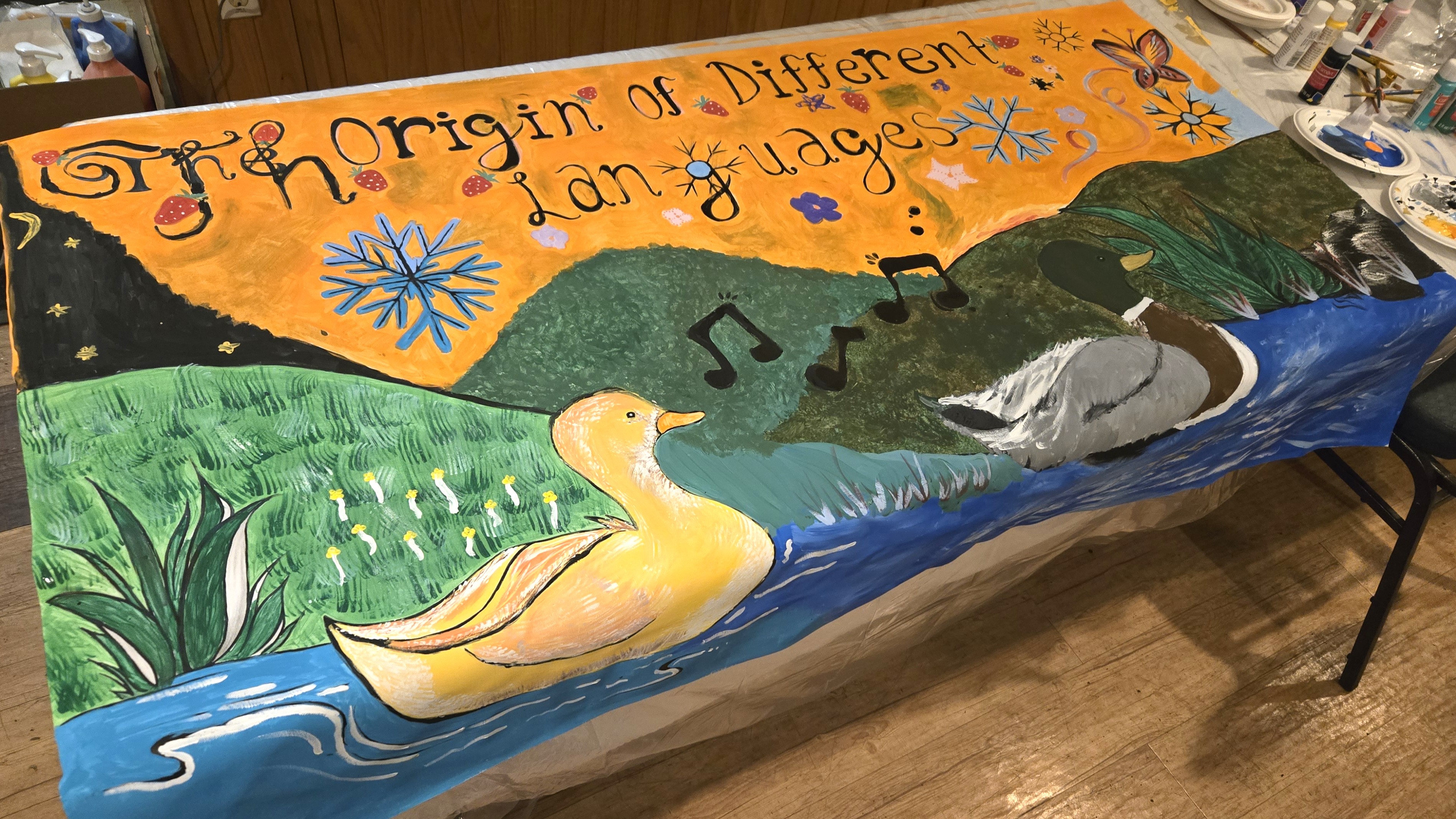 Mural of Sylix story The Origin of Different Languages painted by various retreat attendees / Design: Aliviya Coe