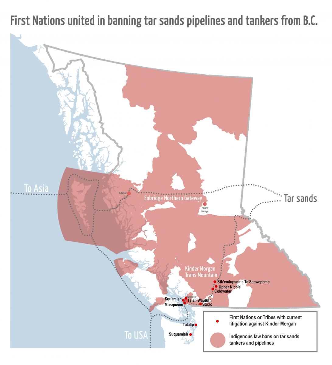 Each of the First Nations’ legal challenges at the Federal Court of Appeal argues that the highest level of consultation is required, and that to date, the level of consultation has been inadequate. In many cases, the federal government has conceded that the duty to consult is at the high end of the legal spectrum. Two of the applicant First Nations have had fishing rights confirmed by the Supreme Court of Canada (SCC) in waters affected by the Project. Most of the legal challenges assert that the First Nation has unextinguished Aboriginal title or rights over the proposed pipeline and tanker route. In the landmark Tsilhqot’in decision, the SCC stated: