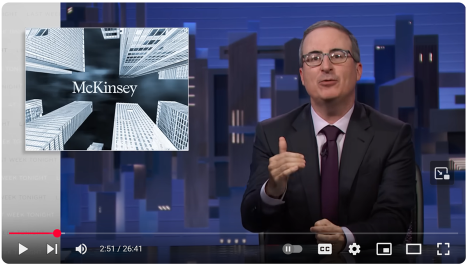 McKinsey is an international company that provides advice to corporations and governments on a wide range of strategy and policy matters. In one of the more hilarious and accessible commentaries on this company and its role in the international world of business, comedian John Oliver explains: